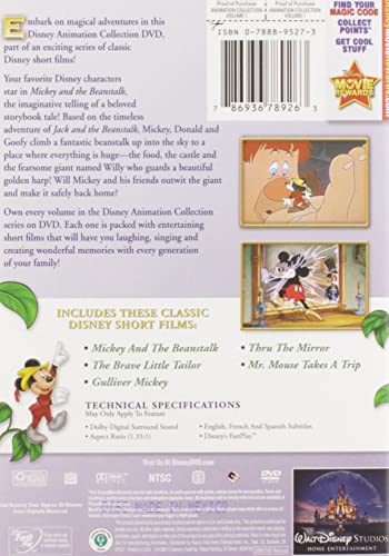 Details: Embark on magical adventures in this Disney Animation Collection DVD, part of an exciting series of classic Disney short films! Your favorite Disney characters star in "Mickey And The Beanstalk," the imaginative telling of a beloved storybook tale! Based on the timeless adventures of "Jack and the Beanstalk," Mickey, Donald and Goofy climb a fantastic beanstalk up into the sky to a place where everything is huge -- the food, the castle and the fearsome giant named Willy who guards a beautiful golden harp! Will Mickey and his friends outwit the giant and make it safely back home? Own every volume in the Disney Animation Collection series on DVD. Each one is packed with entertaining short films that will have you laughing, singing and creating wonderful memories with every generation of your family!