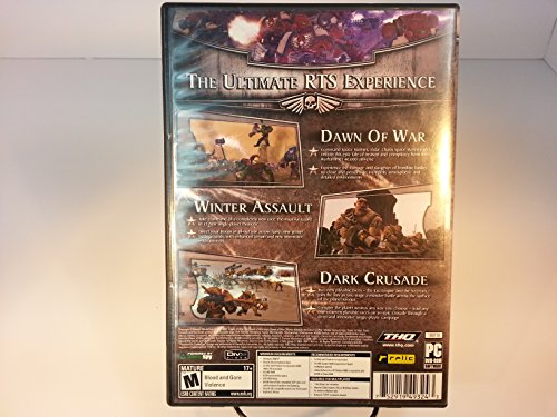 Details: Warhammer 40K: Dawn of WarFrom a darkness beyond imagination dawns a new era in strategic warfare. Ten thousand years have passed since the treasonous acts of Chaos toppled the Golden Age of mankind. Fires burn brightly throughout the galaxies illuminating carnage and slaughter as mankind defends itself from ancient enemies. Hardened forces collide with one goal in mind the complete extermination of their opposition. Relic Entertainment brings the world's most successful table-top game to the PC. Control one of 4 unique races in head-to-head or cooperative multiplayer action where faith skill and strategy are requisites in ruling the universe.Warhammer 40K: Dawn of War - Winter AssaultLost amongst the ruins of a leveled city lies an Emperor Class Titan a war vessel of untold power forged in the planet-wide furnaces of Mars and revered by billions as the epitome of Imperial dominance. The one who controls it will command the power to destroy or defend a world. The Imperials will summon it to overcome great evil Chaos will corrupt it for their own designs Orks will destroy it in their bloodlust and Eldar will disregard it in their arrogance. The expansion pack to the award winning Warhammer 40000: Dawn of War will build upon the most exciting visceral front-line battlefield ever seen in an RTS game. Winter Assault is one of the biggest expansion packs ever.Warhammer 40K: Dawn of War - Dark CrusadeThe bitter war for domination of the remote planet Kronus rages between Tau Orks Space Marines Eldar Imperial Guard and Chaos whilst deep in their tombs beneath the surface the sinister Necrons are awakening after 60 million years in stasis. Now in the 41st millennium they have found a galaxy teeming with life; a galaxy ripe for harvesting.Format: WIN XP Genre: ENTERTAINMENT Rating: M UPC: 752919493243 Manufacturer No: 49324