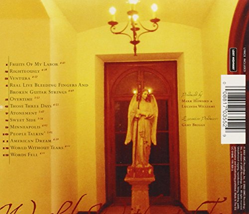 Details: Amazon.ca Most artists who appeal to adult listeners tend to settle into a comfortable niche, but Lucinda Williams refuses to play it safe. Instead, her music stings like an open wound, as she continues to strip away the protective layers from her art's emotional core. Though Williams has long been prized for the naked honesty of her music, this collection is even rawer than its predecessors. From the down-and-dirty bar-band blues of "Atonement" to the Rolling Stones-style swagger of "Bleeding Fingers" to the tricky balance of debasement and transcendence in "Ventura," Williams leaves the nerve endings of her music exposed. With the band opting for first-take immediacy rather than polish, some of the most powerful material is also the neediest, as the singer addresses lovers who have disrespected her ("Righteously") or abandoned her ("Those Three Days," "Minneapolis"). Though her attempts at rap on "Sweet Side" and "American Dream" might cause diehard fans to wince, her willingness to take creative chances reaffirms her position at the vanguard of a rootsy progressivism that transcends musical category. Simply put, there's more Patti Smith in her than there is Patsy Cline. --Don McLeese